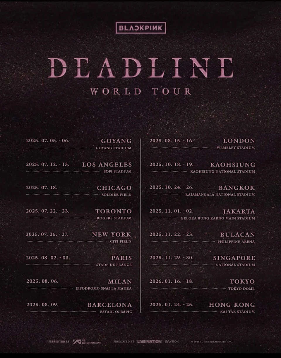 國際超人氣女團 BLACKPINK 日前正式宣佈將展開全新世界巡迴演唱會《DEADLINE》亞洲站,由 Live Nation 主辦,首站將於2025年10月18日(星期六)於高雄國家體育場隆重揭幕,之後將巡演至曼谷、雅加達、馬尼拉及新加坡。最終壓軸場將於2026年1月25及26日假香港啟德體育園舉行連續兩場演出,為亞洲站劃下完美句號。